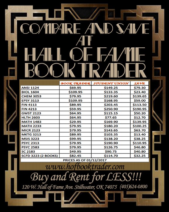 'Been a great run' | News | stwnewspress.com Jordan Bishop/Stillwater News Press Hall of Fame Book Trader, a textbook store at 120 W. Hall of Fame Ave. in Stillwater, is closing in a few weeks after more than 20 years of service.