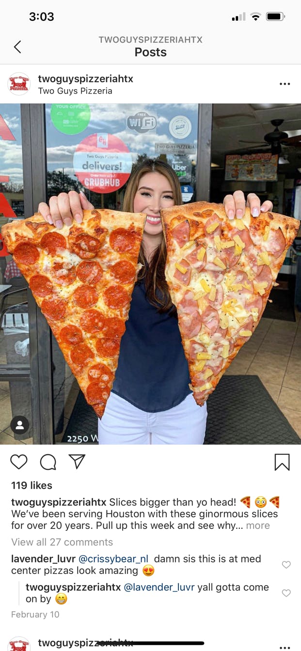 Two Guys Pizzeria Menu: Pizza Delivery Houston, TX - Slice Order PIZZA delivery from Two Guys Pizzeria in Houston instantly! View Two Guys Pizzeria's menu / deals + Schedule delivery now. ... Deals and Coupons Show all. Deal Featured. University Special. Medium 12'' three topping soda & 2 liter drink. $19.99. ... Tomato Pie; Grandma Pizza; Thin Crust Pizza; Stuffed Pizza; Thick Crust Pizza; View All ...